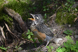 The best thing you can do if you come across a young animal or bird is leave it alone; and if you have pets, put them inside or on a leash. Picking up young wildlife might seem like the right thing to do; but in most cases, they have a much better chance at survival when not disrupted by humans or pets. Well-meaning people who take young animals out of the wild are actually harming the animals' chances of becoming normal adults. Animals that are taken by people and later released into the wild are at a disadvantage, as they lack the skills needed to find natural food and cover. Young wildlife cared for by humans often end up attached to people, with natural little fear. These animals sometimes end up wandering into populated areas, being attacked by domestic animals, being hit by cars, or even injuring people.