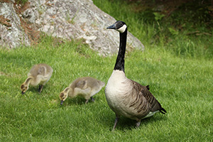 Canada geese are among the most familiar birds in Maine. They are a source of recreation for bird watchers and hunters and symbolize nature for many people. It is challenging to miss the clear honking call of Canada geese as they fly overhead in their V-shaped formation. Geese are known seed dispersers, providing important dispersal of vegetation to grow in new areas once digested and excreted by the animal. Never feed geese and consider changing the habitat to prevent conflict.